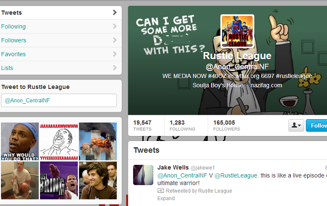 O grupo hacker Anonymous possui a conta no Twitter @Anon_Central. Recentemente este perfil foi atacado por um grupo rival dos Anonymous, o Rustle League.